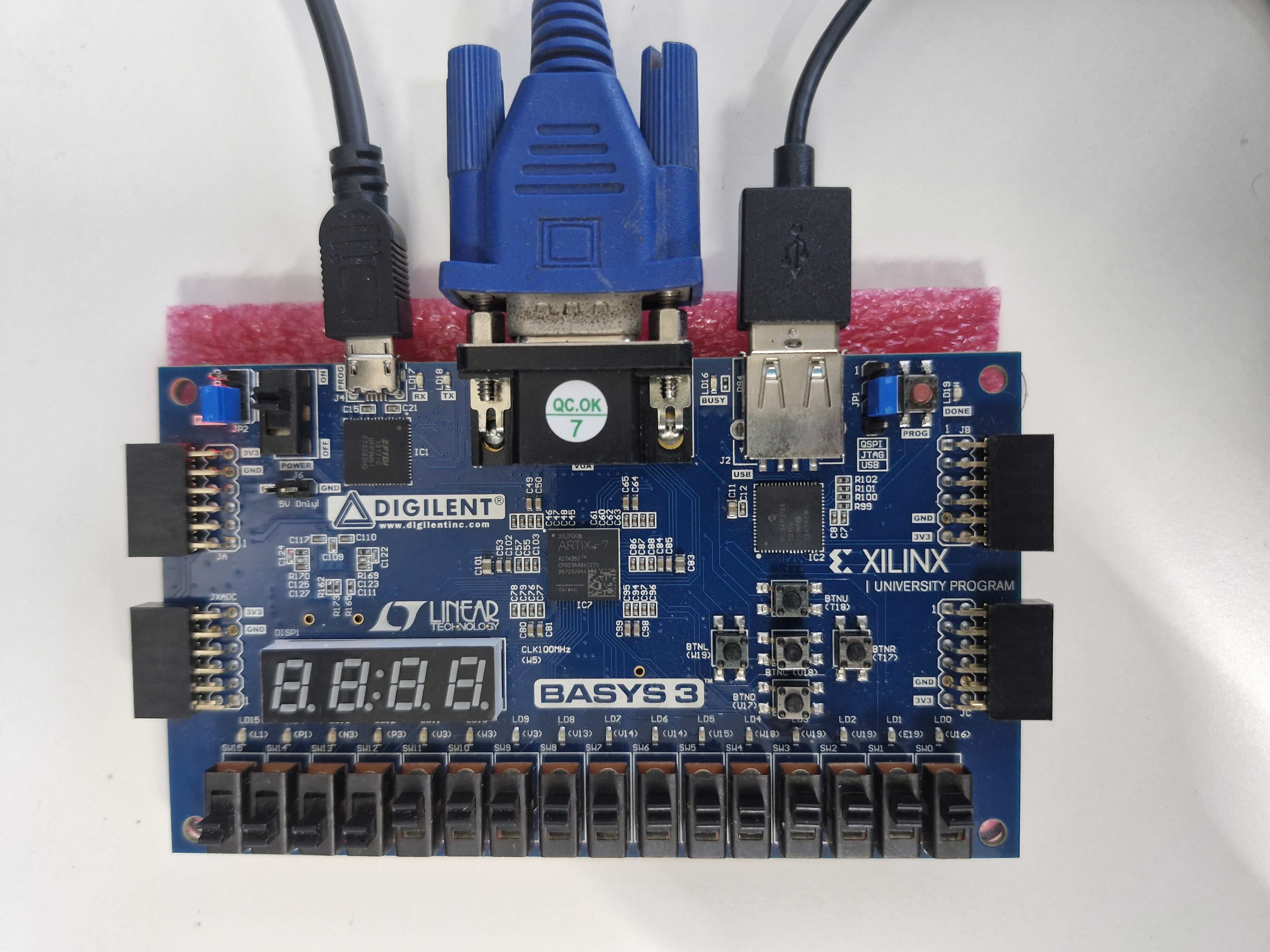 I used the Basys 3 development board by Xilinx. The board has an Artix 7 FPGA. The board features a USB port and a VGA port for connecting a keyboard and a monitor. Although we can establish these connections, we need to implement the CPU along with a driver for communication with the keyboard and display.