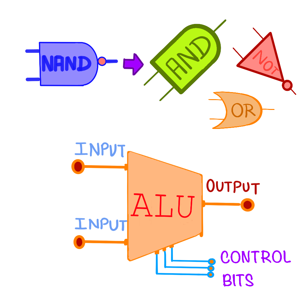 The course begins by assuming the NAND gate is given and proceeds to construct digital circuits using it. We develop the ALU and combine it with memory and registers using buses to build simulated hardware.